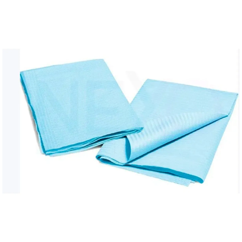 Babero o Servilleta dental desechable de alta calidad, fabricado con 2 capas de papel absorbente y una lámina de polietileno de baja densidad que garantiza impermeabilidad y protección durante los procedimientos clínicos.
