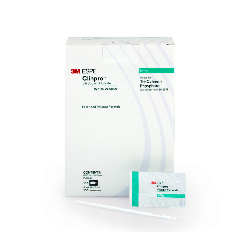 Clinpro™ White Varnish permanece en forma fluida por más tiempo que otros barnices dentales probados, y continúa migrando desde las superficies dentales tratadas a las no tratadas, incluyendo áreas interproximales. Un barniz dental del color del diente, optimizado con una liberación prolongada de flúor, calcio y fosfato: hasta 24 horas. Contiene 22,600 ppm de fluoruro y fosfato tricálcico (TCP).