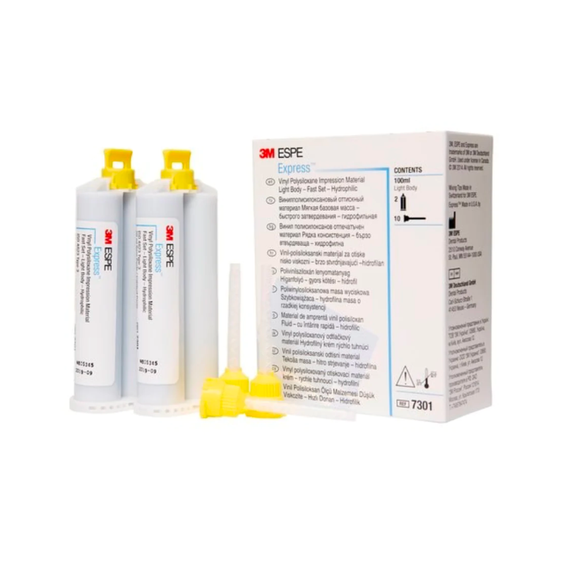 El primer sistema de automezcla de un vinil polisiloxano (VPS) utilizado. Con más de 20 años de confiabilidad comprobada, el material de impresión Express ofrece una masilla de mezcla manual y un conveniente dispensador de cartuchos fácil de usar. El material liviano se mezcla en forma precisa y automática a través de la Pistola Garant.