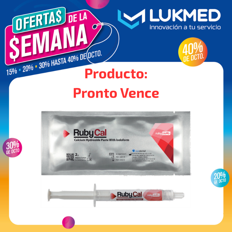 RubyCal es una pasta lista para usar, compuesta de hidróxido de calcio e yodoformo, indicada para procedimientos endodónticos. Presentada en jeringa de 2 gramos, esta formulación combina la acción bactericida del yodoformo con las propiedades reparadoras y desinfectantes del hidróxido de calcio, favoreciendo un entorno alcalino que estimula la formación de tejido duro y la reparación periapical.